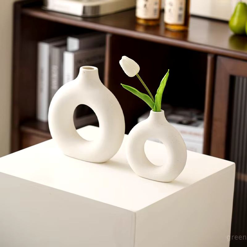 This set of two ring shaped vases is perfect as table decoration. It is intended for dry plants only as it cannot hold water.